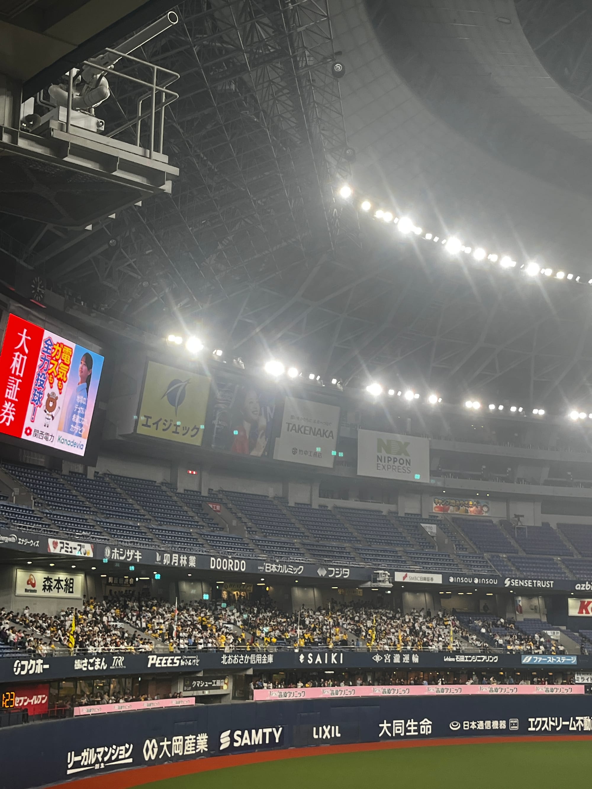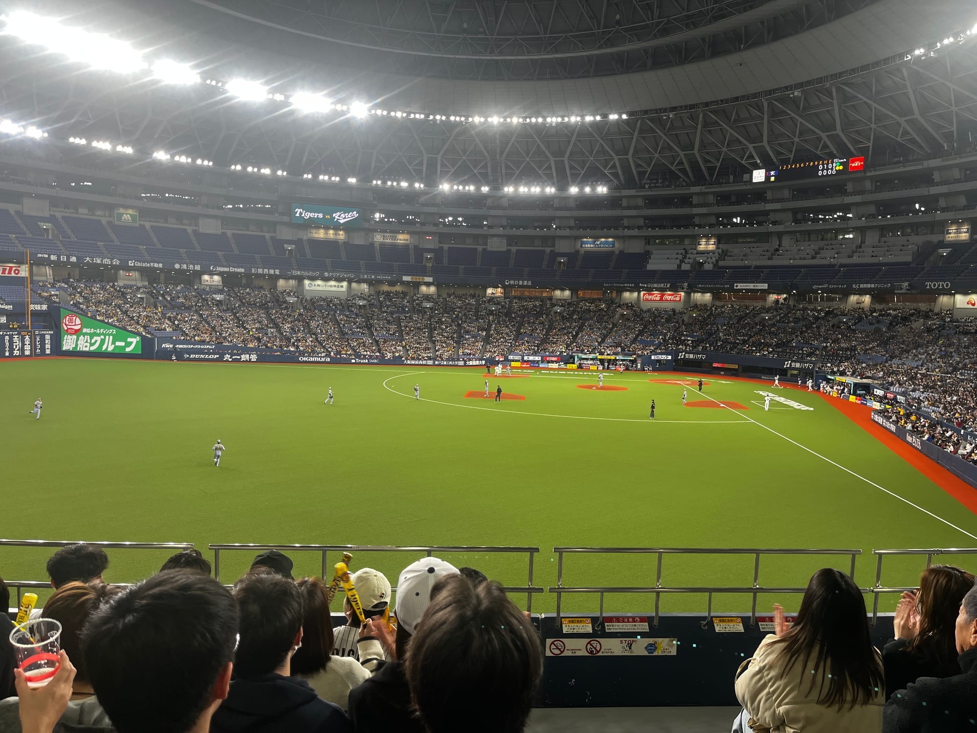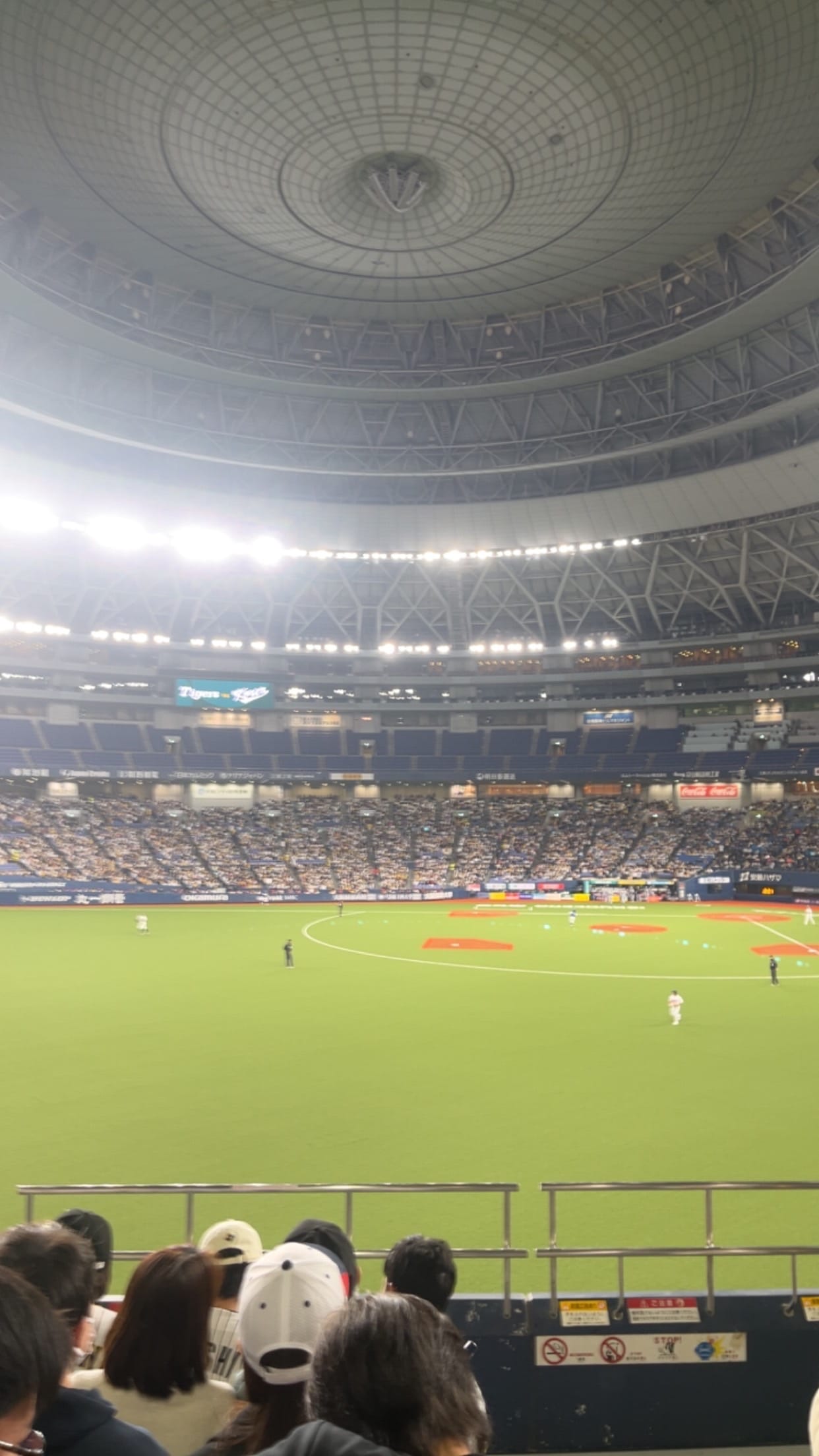 The listing I decided to purchase was by someone with a name that translated to White Black Fox. 10 back and forth messages later, I was outside gate 1 of the Osaka Kyocera Dome looking for someone wearing a white team Japan jersey, sunglasses, and a Shohei Ohtani #16 hat. The person that came up to me, an older lady with a stack of tickets and a beer in her hand, did not fit my mental image of a ticketjam reseller, but I was more than thankful nonetheless. My bag was checked, I walked through the metal detector, my newly acquired ticket was scanned, and I was in. It was about 17 minutes before gametime and I had no desire to get to my seats. I walked into the nearest seating bowl opening and it was all worth it. Team Korea's introductions had just concluded, anthems were about to begin, and first pitch was imminent. Before finding my seat, I treated myself to the classic ballpark pairing of fried noodles and a coke. An usher walked me to my aisle seat in left field and I was sitting down as the Hanshin Tigers ran onto the field. Korea quickly attacked the Tigers, scoring two runs in the 1st which would be the only scoring before a loud, game tying, Ryan Mountcastle-esque home run to center field in the visitor's half of the 5th inning. Even with it being an exhibition, Japan's strict rules regarding fans and home run ball souvenirs held. Ushers from 2-3 sections over on each side rushed to the area of the home run and checked on the fan before taking the ball and the fan immediately obliged.